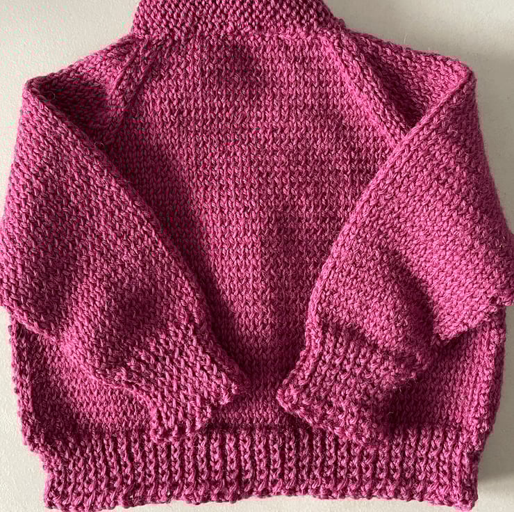 Hand knitted v neck cardigan in burgundy wool. Chest size 20 inches / 50 cm (under arms) Has a 5 button front fastening. The length is 9 inches / 23cm neck to hem without collar and sleeves measures 10 inches / 25 cm from neck to sleeve hem.