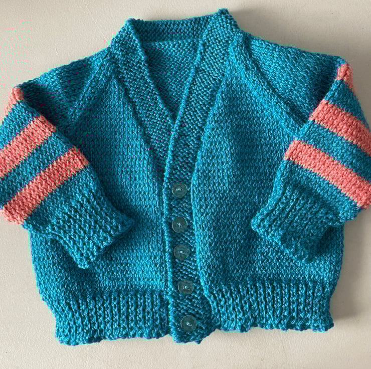 Hand knitted v neck cardigan in blue and orange wool. Plain body and striped sleeves. Chest size 20 inches / 50 cm (under arms) Has a 5 button front fastening. The length is 9 inches / 23cm neck to hem without collar and sleeves measures 10 inches / 25 cm from neck to sleeve hem.