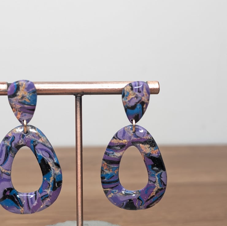 Hand made polymer clay earrings with an abstract pattern coated in resin with a and gold embellishment. Fixing can be painted with hypo allergenic coating on request for free on request. Please see all photos for close up detail. All products handmade therefore there may be minor imperfections. Each pair sold as seen, message for more info