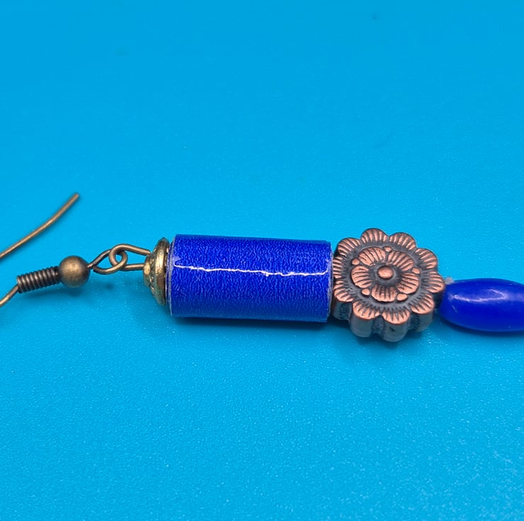 Midnight blue paper beaded earrings with bronze tone flower bead. Made with recycled gift wrapping paper and preloved metal and plastic beads.
