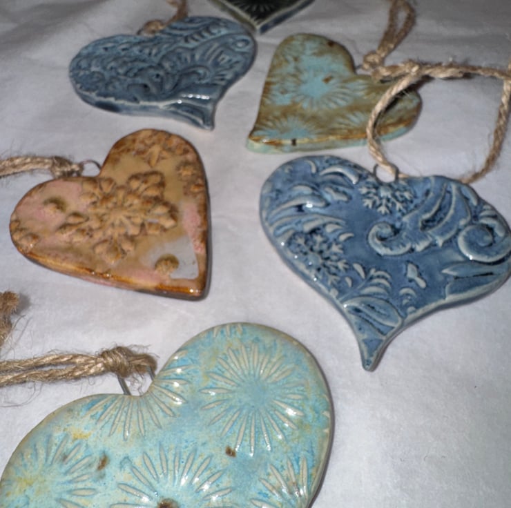 Selection of hand made ceramic glazed hearts, the largest being approximately 3”