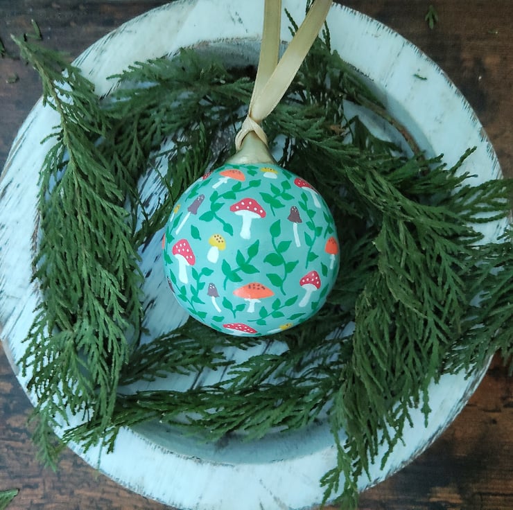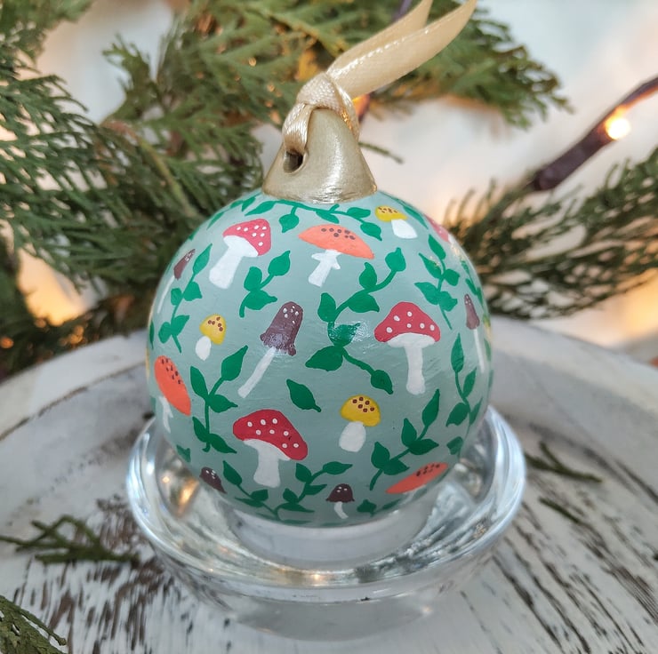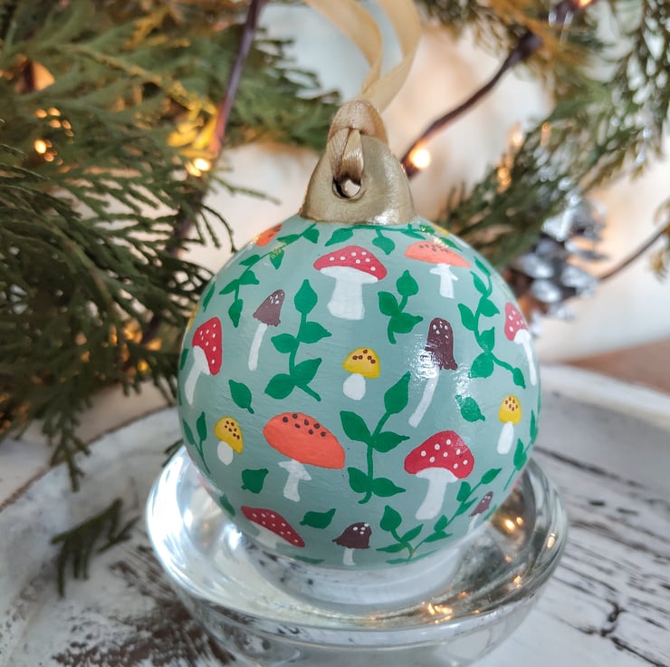 If you're leaning towards a nature theme this Christmas, our hand painted, green toadstool Christmas bauble may be just the finishing touch you're looking for. Decorated by hand, this whimsical, 6 cm ceramic mushroom bauble features an array of fabulous British fungi, including some you may recognise, such as fly agaric and the shaggy ink cap. Simple green vines add pretty contrast against the pale green background, while the gold dome upgrades this pretty toadstool decoration to festive status. Each bauble is finished with three coats of matte, water based varnish, and a length of coordinating gold ribbon ready for hanging.