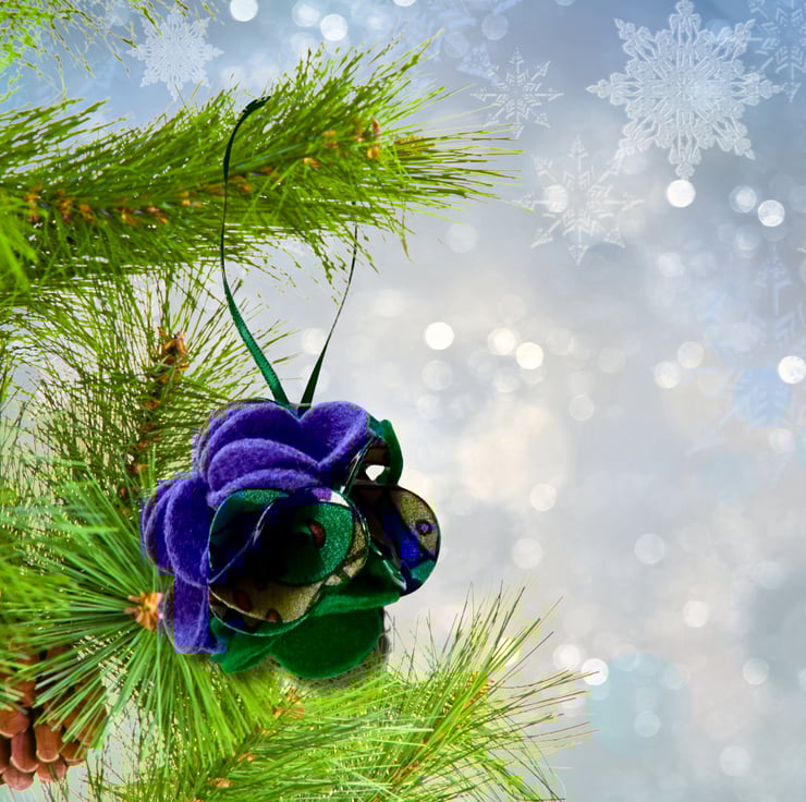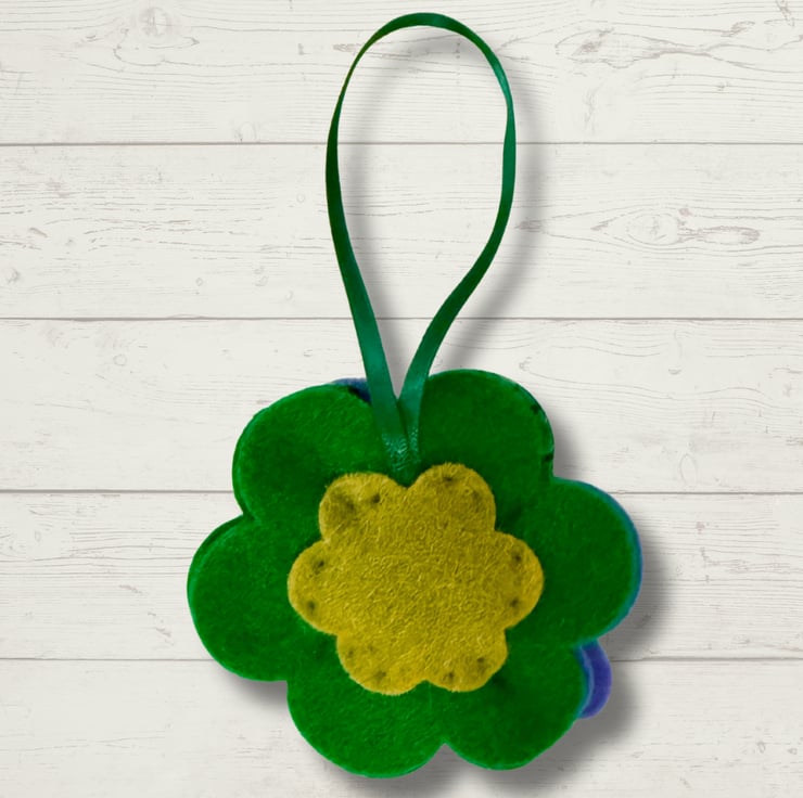Add a touch of handmade charm to your Christmas tree with this beautiful fabric flower bauble. Made from green felt and purple and green patterned fabric.