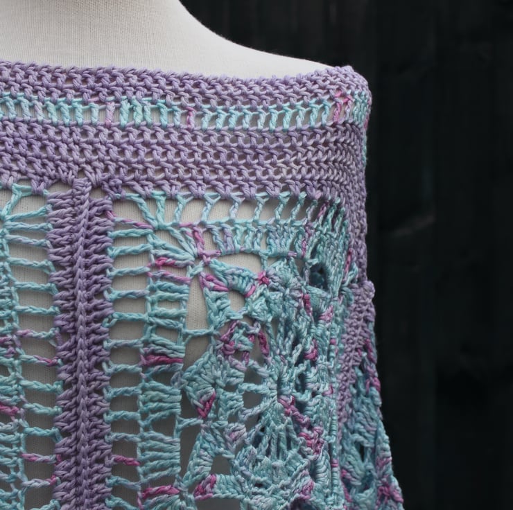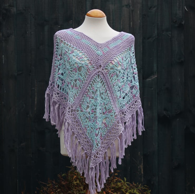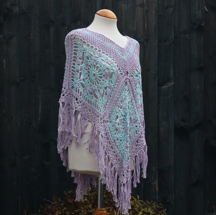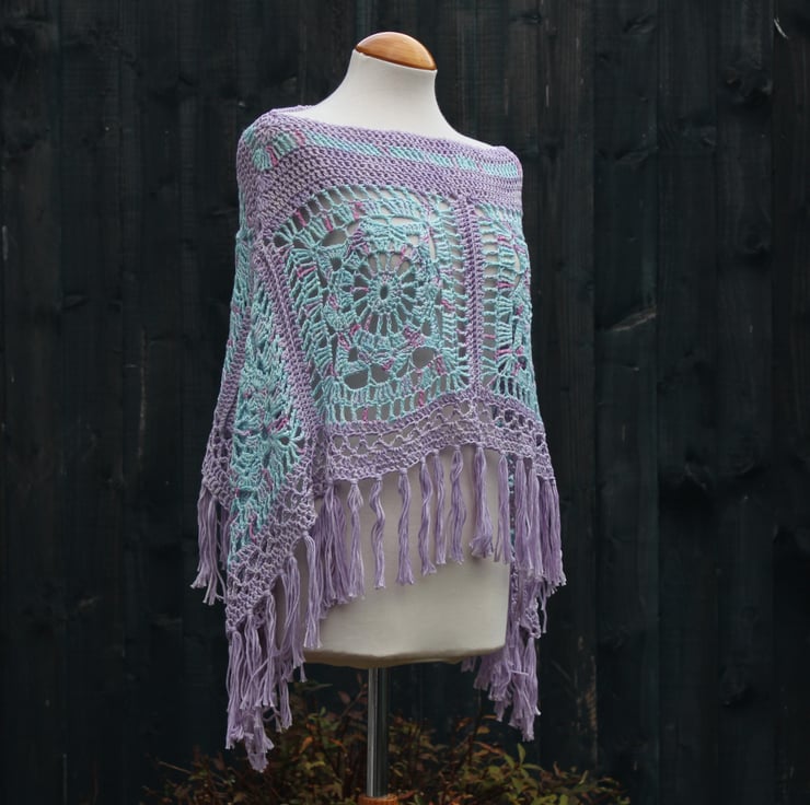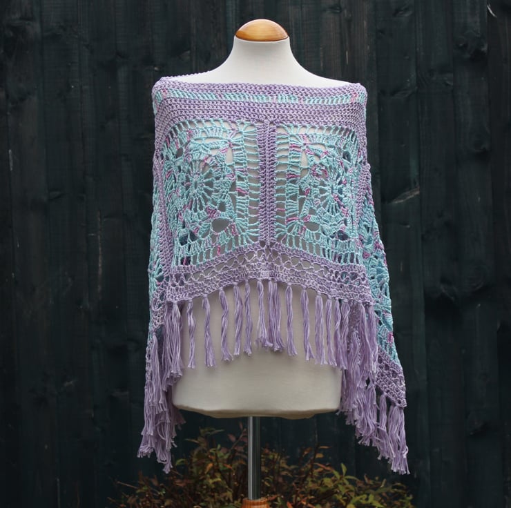 This pretty fringed crochet poncho is a one-of-a-kind creation. Crocheted using high-quality hand-dyed yarn in tonal lavender and a blue-pink mix. Consisting of six crochet panels, which are joined to give an interesting textured line of stitches between them. It is designed to be worn square, allowing a whole panel to drape down and cover each arm. However, it also looks good when worn in the traditional triangular poncho style.