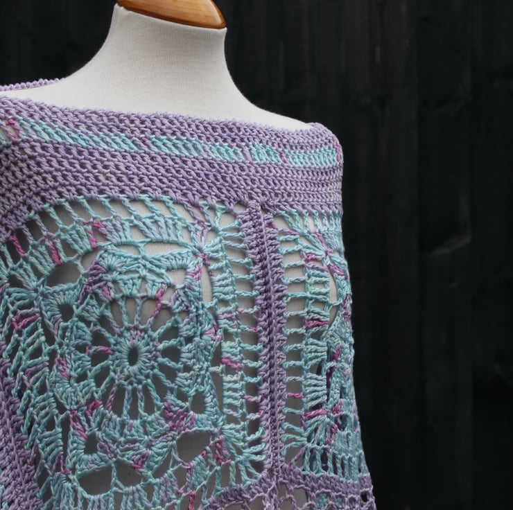 If you would like to see more photographs and read about how this poncho was made, please visit my blog post about it. https://drapedinlacebyjuliablakeman.blogspot.com/2025/10/design-a452-blue-mix-lilac-poncho.html