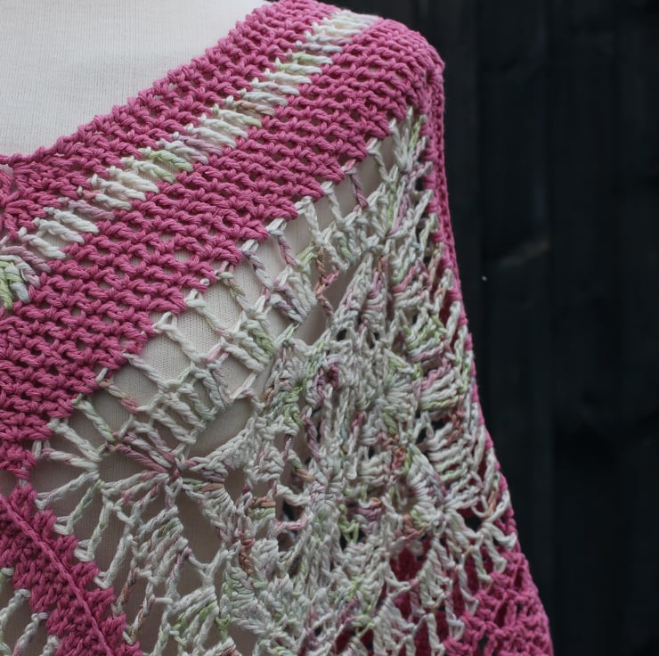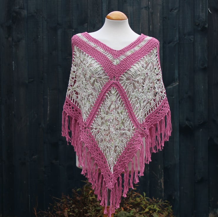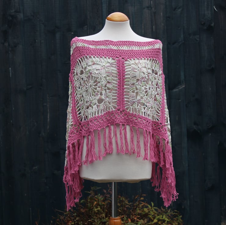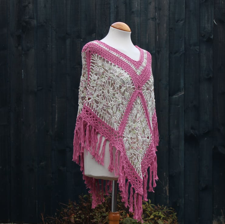 This pretty fringed crochet poncho is crocheted using high-quality hand-dyed yarn in white-green-pink and a pink cotton blend yarn. Consisting of six crochet panels, which are joined to give an interesting textured line of stitches between them. It is designed to be worn square, allowing a whole panel to drape down and cover each arm. However, it also looks good when worn in the traditional triangular poncho style.
