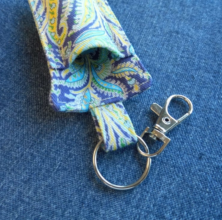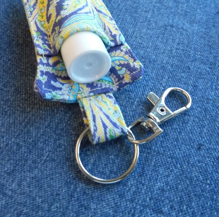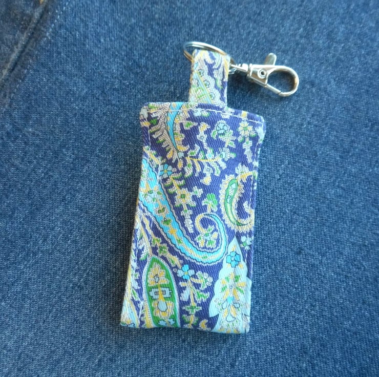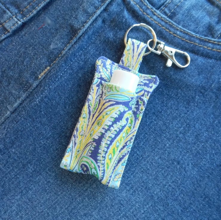 This is a little fabric pouch designed to keep your lip balm stick handily clipped to your bag, purse etc. For this one, I used a modern paisley fabric in blues and greens from Liberty.