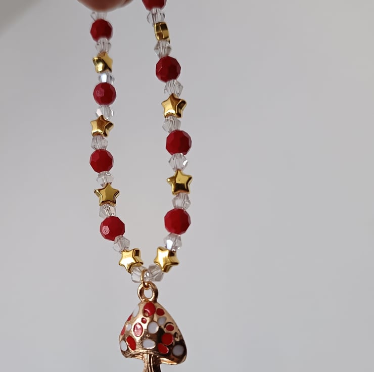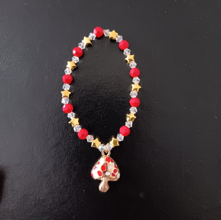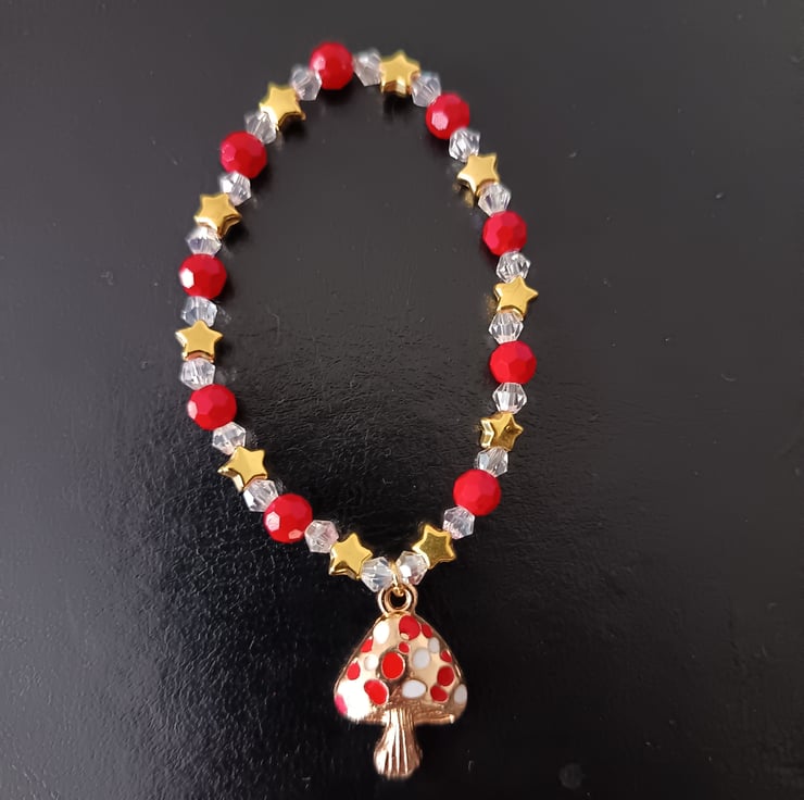 This handmade bracelet is crafted with magic stretch elastic, clear and red glass beads, gold star beads and featuring a white, gold and red toadstool charm.