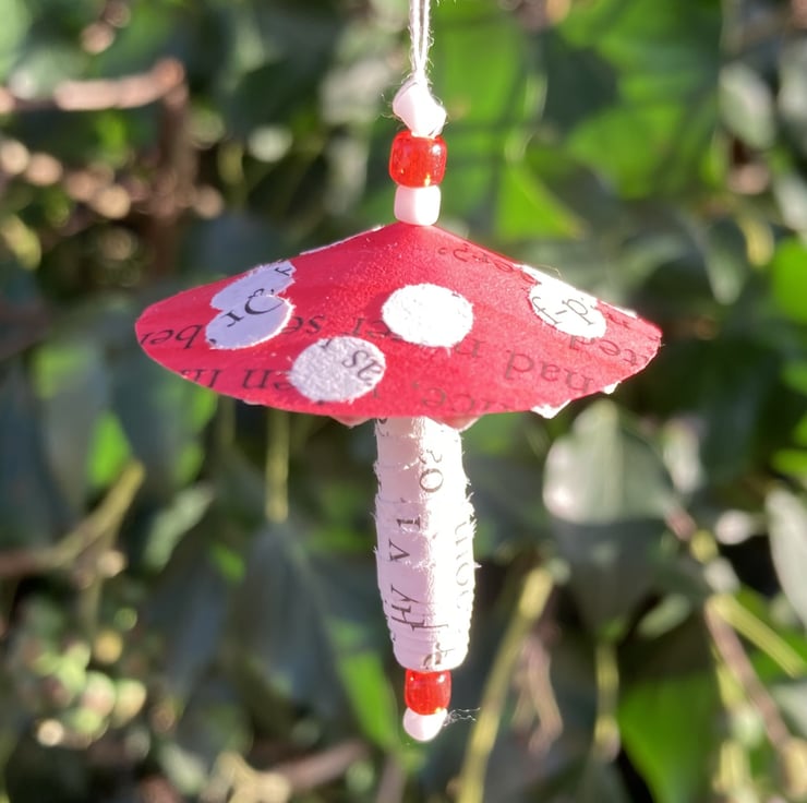 Each mushrooms consists of a shapely rolled-paper stem, a red paper cap with white paper spots and a folded paper frill underneath. These paper parts are approx 3.5cm and are assembled with glue and threaded onto white cotton with red and white beads. The finished decoration is approx 5cm tall with approx 13.5cm hanging thread.