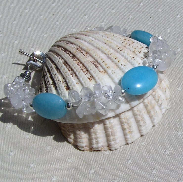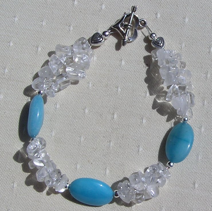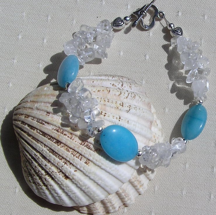 This Stunning Bracelet is made from three Blue/Green Amazonite Oval shaped Beads separated by double-stranded Clear Quartz Gem-Stone Chips with a tiny Silver Heart at each end - a Mystical combination that will look stunning either worn casually or with something more Elegant for a Special Evening out