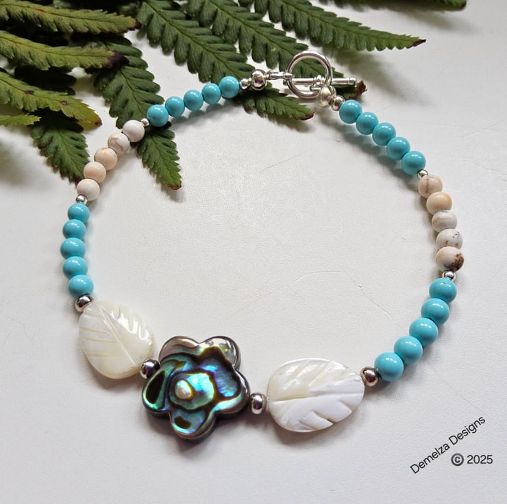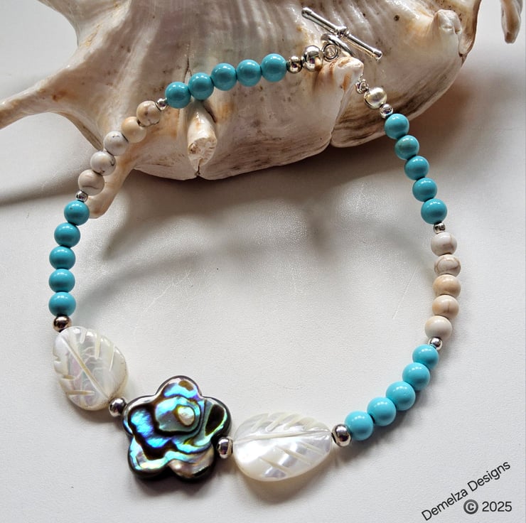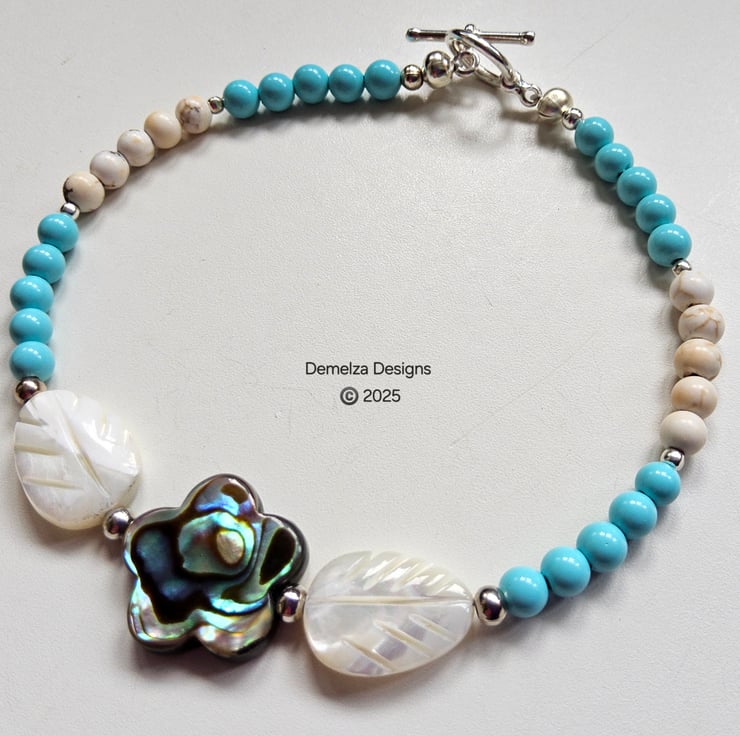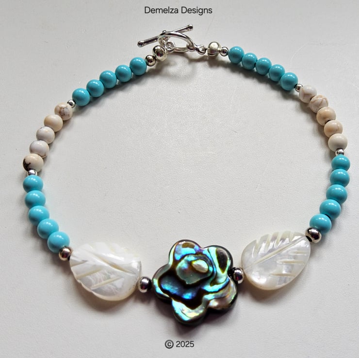 In the centre is a quality double sided genuine Newzeland Abalone Shell flower measuring 15mm. To either side are hand carved mother of pearl leaf cut beads following on with turquoise and cream coloured 4mm smooth round howelite stones. Within the design are quality silver plated spacer beads.