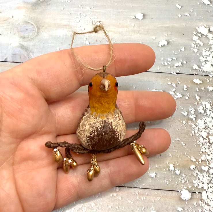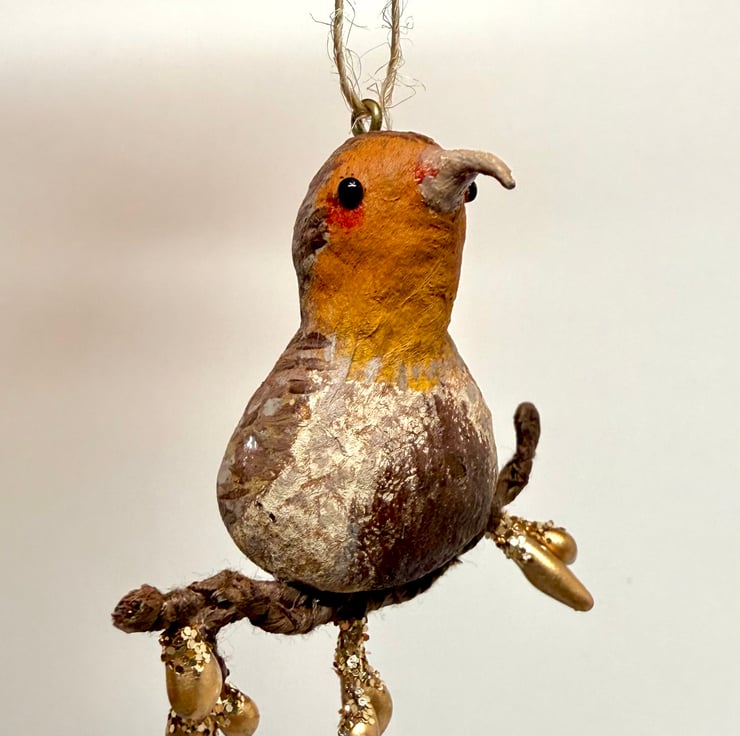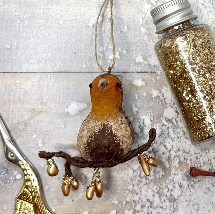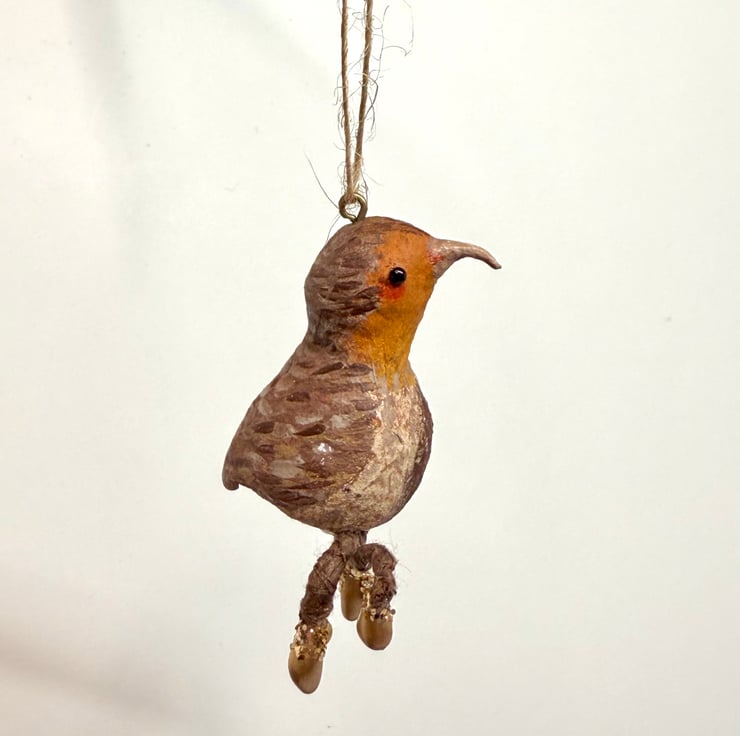 Grey Partridge decoration made using spun cotton and then hand painted. Partridge has glass bead eyes and sits atop a pear tree branch. Branch is paper and thread covered wire with hanging gold pears topped with glitter. Partridge comes with twine hanger attached. Measures roughly 6cm tall.