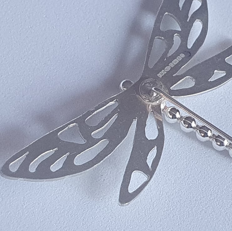 Handcrafted in a small Sheffield studio, this brooch features a beautifully detailed dragonfly, hand-pierced from sterling silver. The dragonfly has a 6 cm wingspan and a 3 mm thick beaded body measuring 6 cm in length. It is finished with a secure pin-and-protector fitting and is hallmarked in Sheffield.