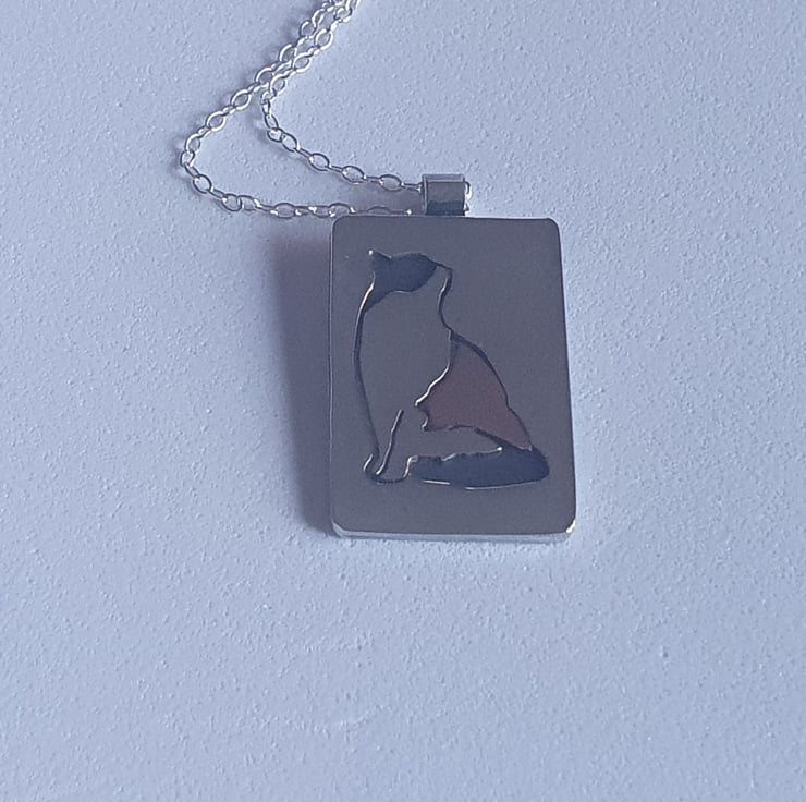 Handcrafted in a small Sheffield studio, this sterling silver calico cat necklace is hallmarked and beautifully detailed. The cat is hand-pierced from a sheet of silver, then soldered onto a second silver layer to create depth. Selected cut-out sections are soldered back in place, and copper elements are added to form the calico pattern. The piece is then oxidised to enhance definition and texture. A small silver tube, soldered to the top of the pendant, allows it to hang elegantly from the chain.