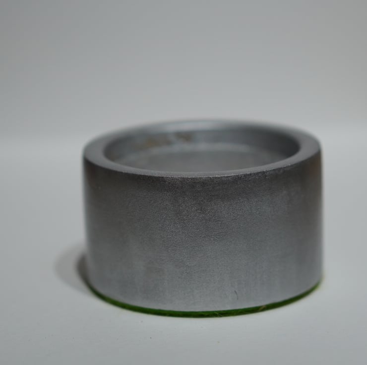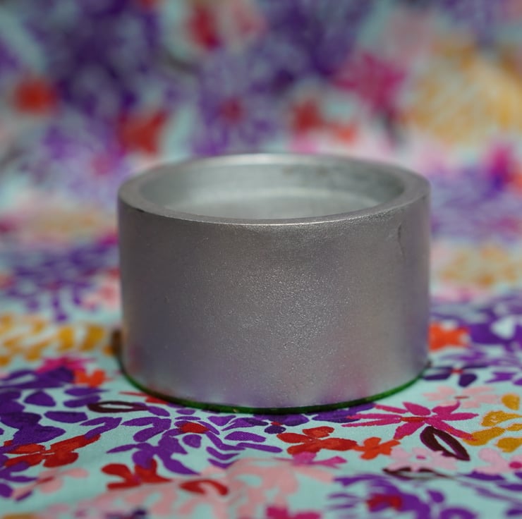 Turned poplar wood candle holder, 7cm diameter and 4cm tall to fit a 5.8cm diameter candle. Finished with a silver paint with a clear lacquer with a felt base to prevent scratches on your surfaces.