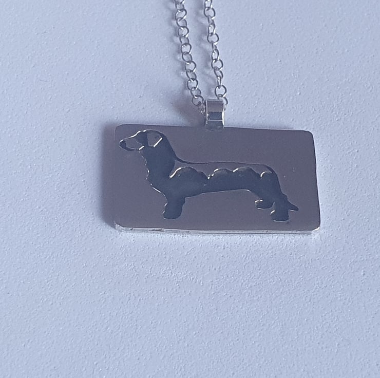 Handcrafted in a small Sheffield studio, this necklace features a charming Dachshund, hand-pierced from sterling silver and oxidised to enhance its detail and character. The pendant measures 1.6 cm by 2.7 cm and is suspended from a 46 cm trace chain.