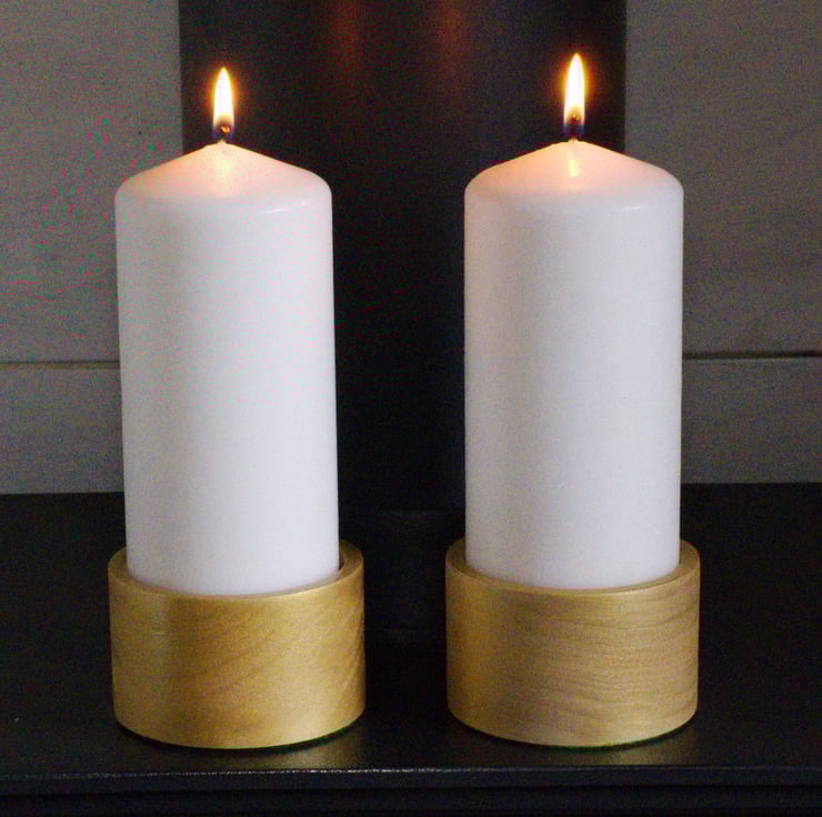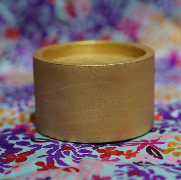 Turned poplar wood candle holder, 8cm diameter and 5cm tall to fit a 6.8cm diameter candle. Finished with a gold paint with a clear lacquer with a felt base to prevent scratches on your surfaces.