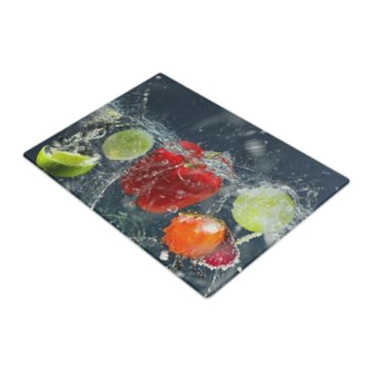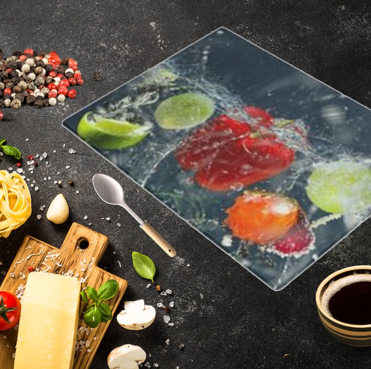 Bring a burst of freshness to your kitchen with this vibrant Centre Pepper & Mixed Fruits In Transparent Water Bubbles Glass Chopping Board. At the heart of the design sits a bold, glossy pepper surrounded by an uplifting mix of colourful fruits, all suspended in delicate, crystal-clear water bubbles. The effect is bright, crisp, and beautifully refreshing—like a splash of vitality captured in glass.