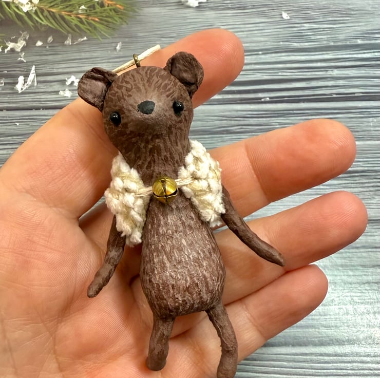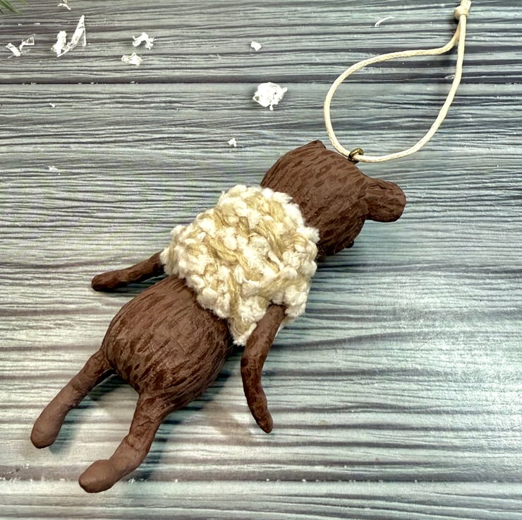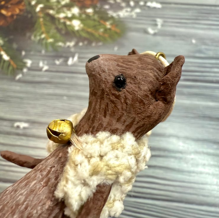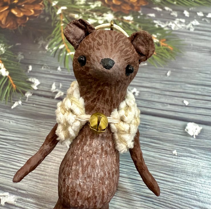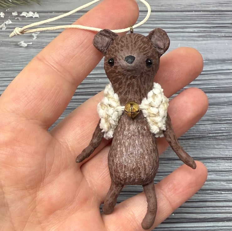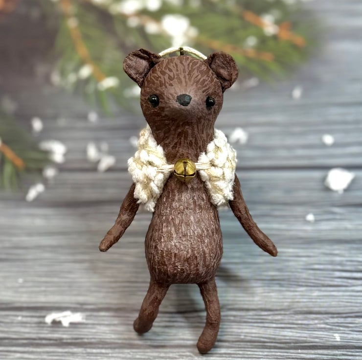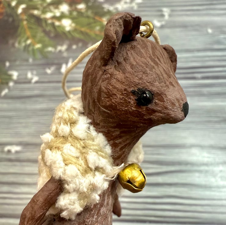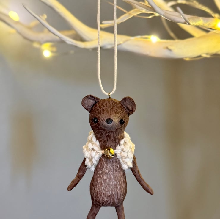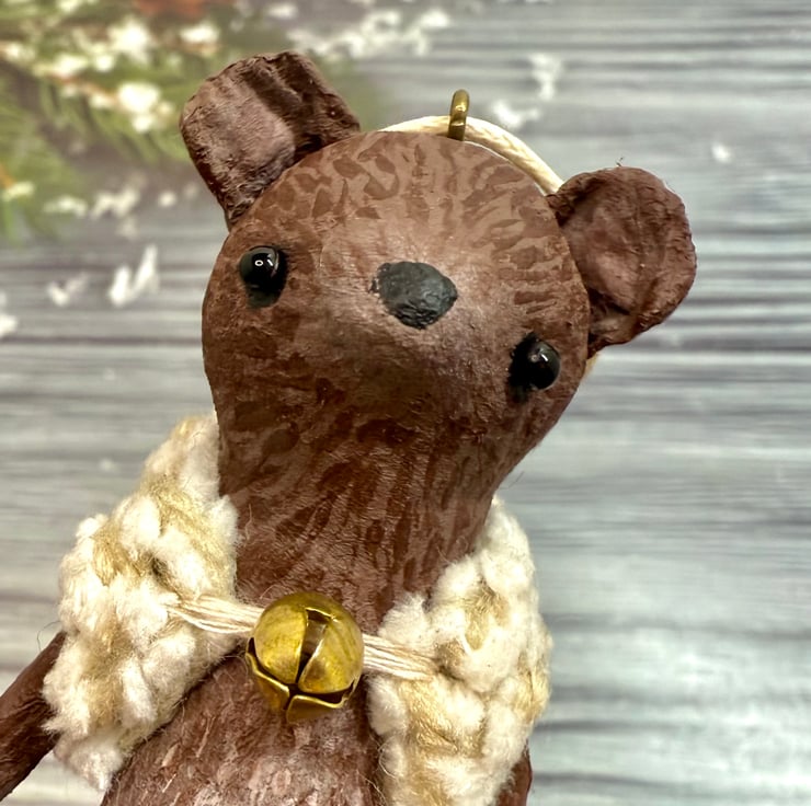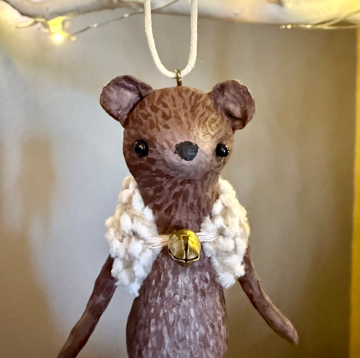 Christmas bear decoration made using spun cotton and then hand painted. Bear has crochet yarn waistcoat with little gold bell fastener sewn into place. Bear comes with waxed string hanger attached. Measures roughly 9cm tall.