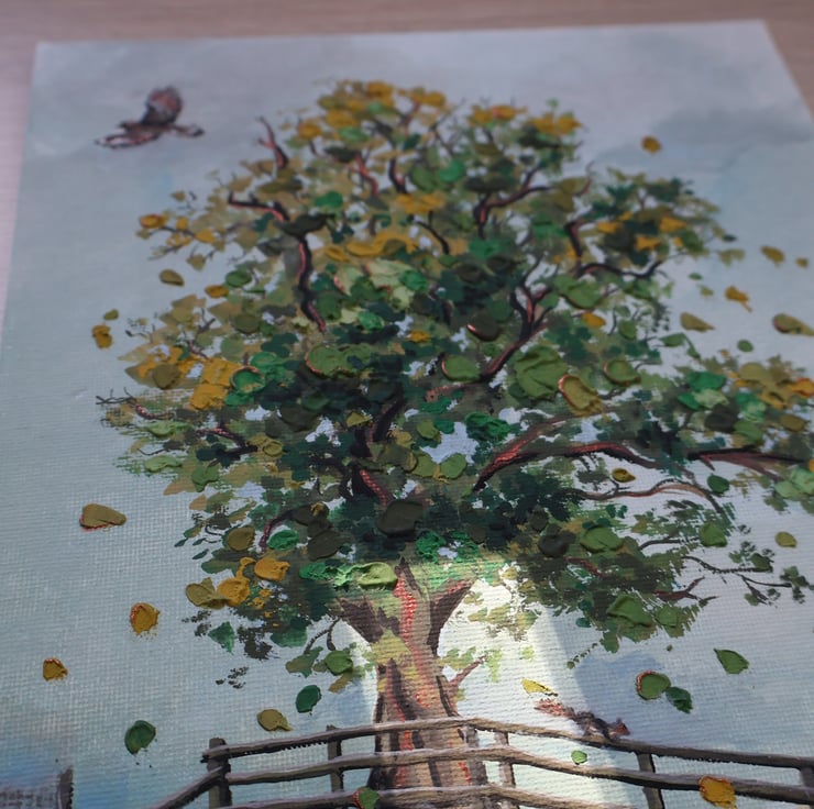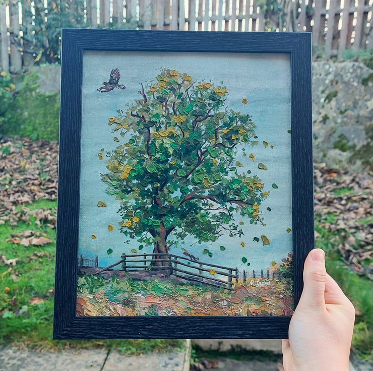 This original painting was inspired by a tree that I saw when walking my dog up the local cycle track one windy morning, as the slowly yellowing leaves danced on the breeze under a pale autumn sky. I wanted to preserve the wonderful feeling of watching this charming performance in a painting. I added a buzzard and a squirrel to the scene, making the painting feel lived in. As you move around the painting, you may notice a subtle bronze shine as it catches the light, adding to the magical atmosphere.