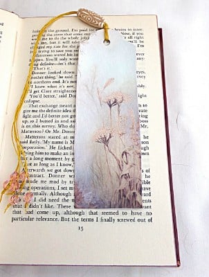 A upcycled card bookmark that features a vintage floral design, with wheat gold nylon cord and a acrylic feature bead, and fire polish ab glass beads