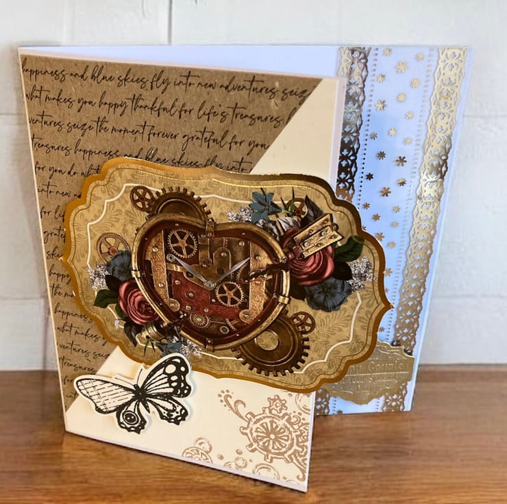 Inside, a luxurious layer of gold acetate adds shine and elegance, while the shaped front panel gives the card a distinctive handcrafted finish. A delicate 3D butterfly completes the design.