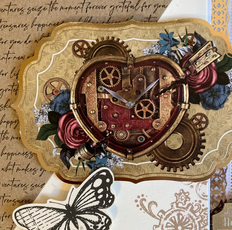 The background is created on kraft cardstock printed with vintage-style sentiments, topped with a cream angled layer decorated with cogs for added texture and depth.