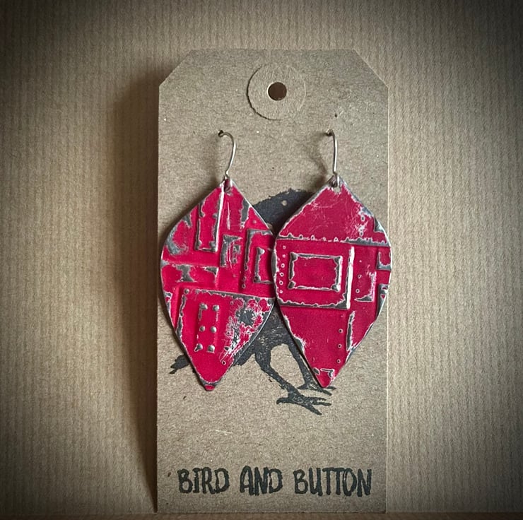 These earrings were cut from a red M&S biscuit tin and embossed with a riveted, industrial metal plate design. They were further distressed by hand.