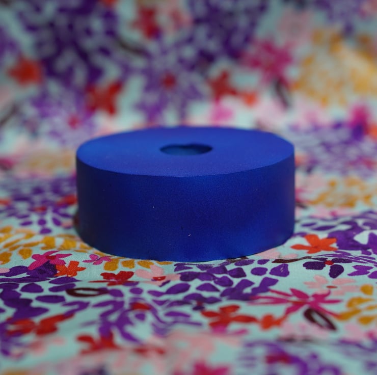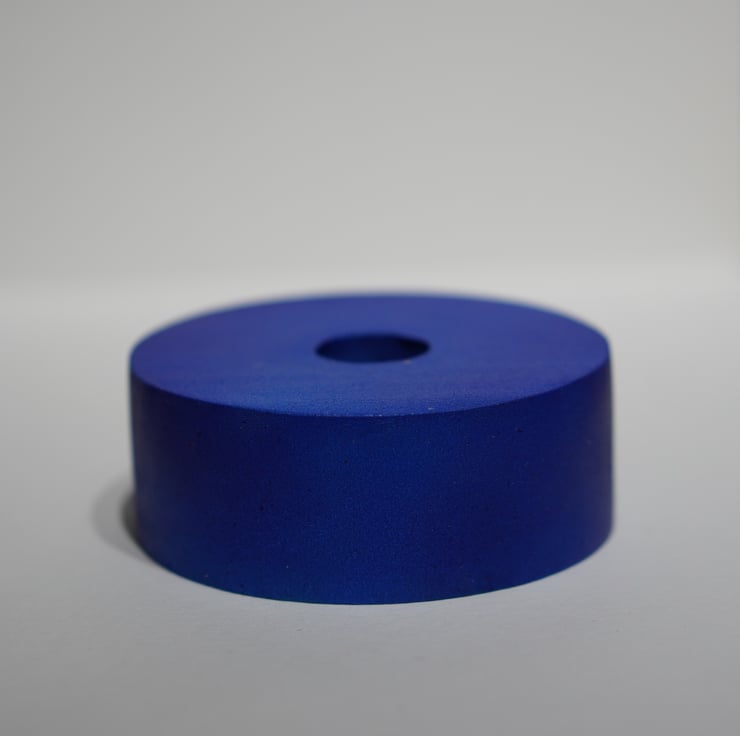 Turned poplar wood candle holder, 7.5cm diameter and 3cm tall. Finished with a blue paint with a clear lacquer with a felt base to prevent scratches on your surfaces.