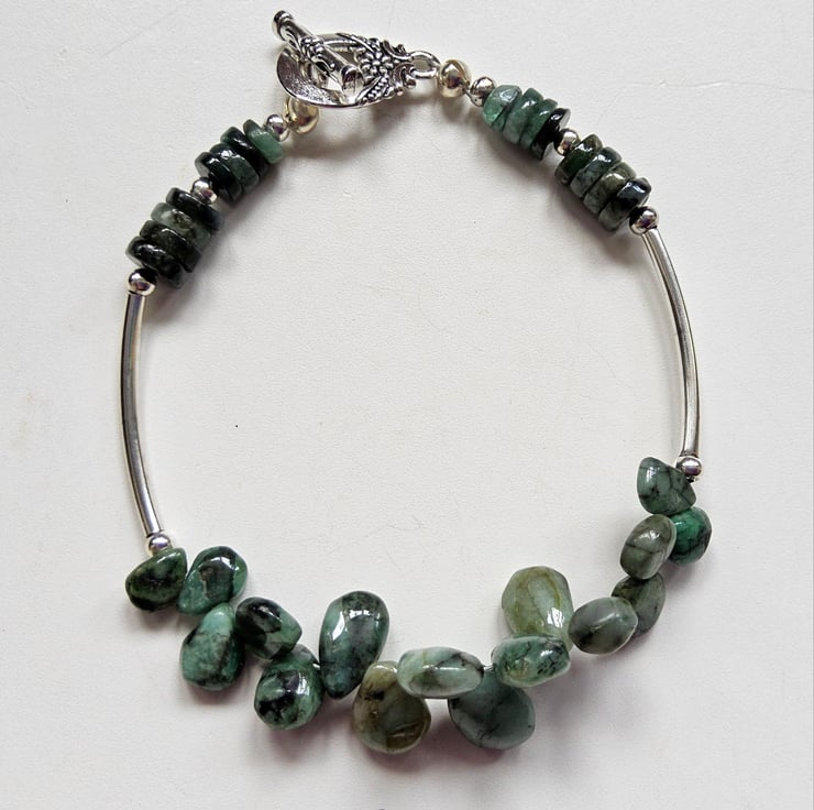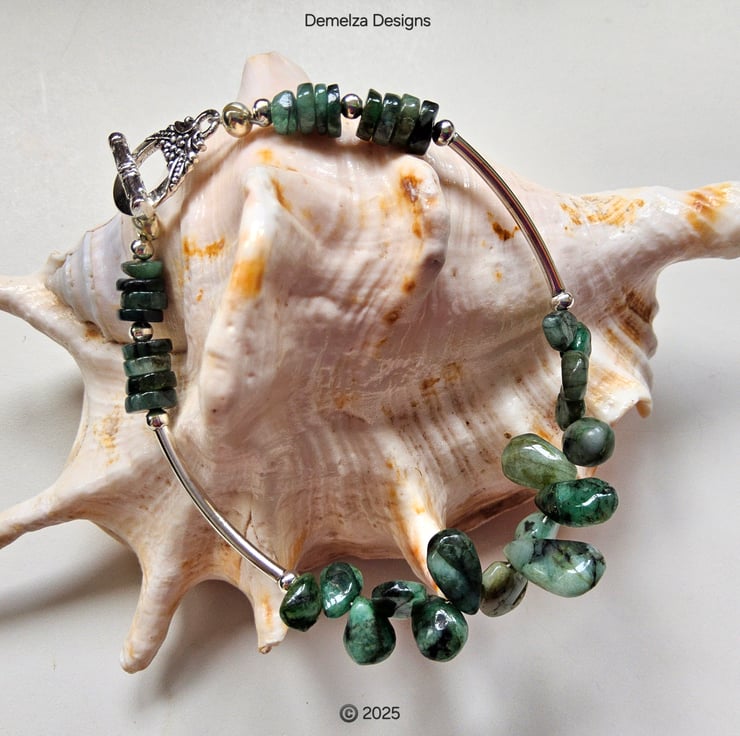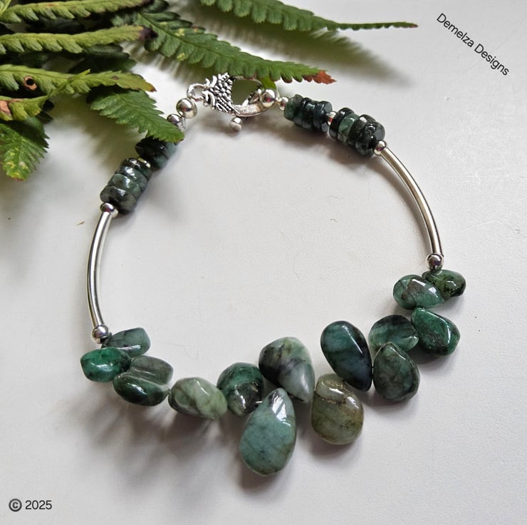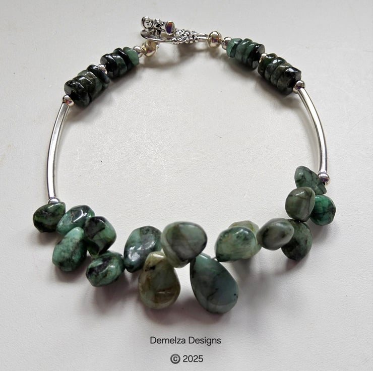 In the centre are irregular pear drop cut raw emeralds which graduate in size towards the back. Following on are quality silver plated spacer beads and tubes to irregular cut wheel cut raw emeralds. Raw emeralds have not undertaken any expensive form of heat treatment to enhance their colour or clarity, therefore, are regarded as environmental friendly for those seeking emerald jewellery.