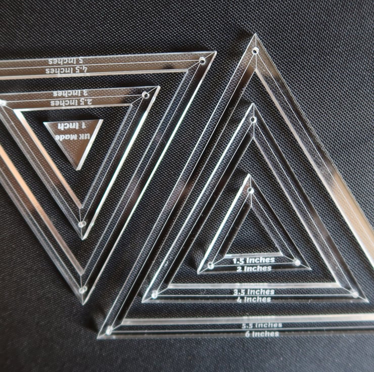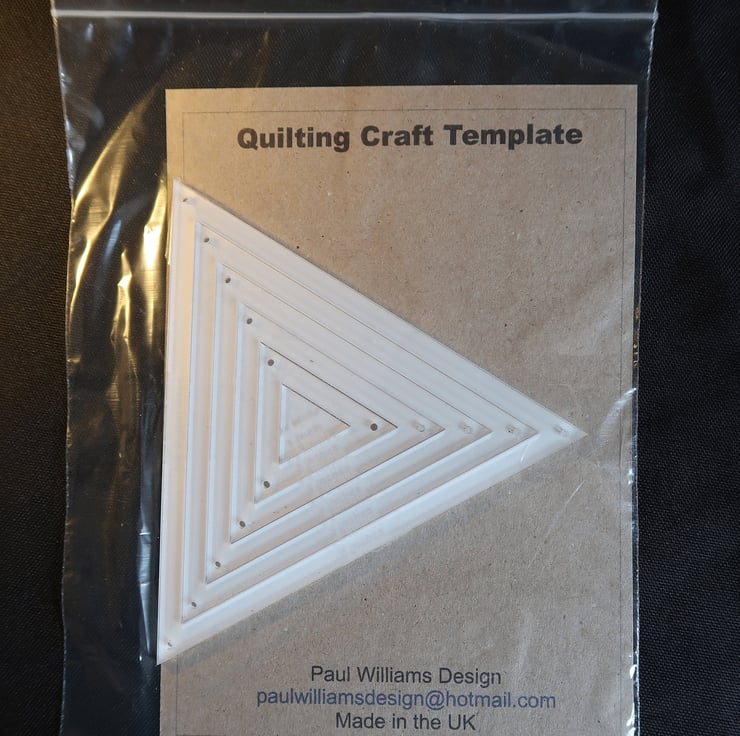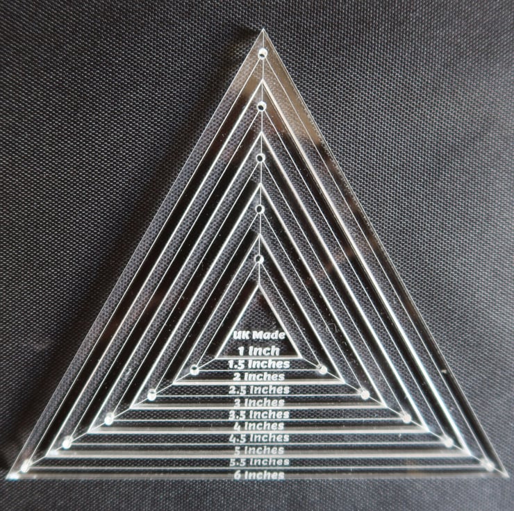 A handy equilateral triangular or pyramid shape template with a variety of applications particularly quilt making, but a whole range of uses throughout crafting and hobbies