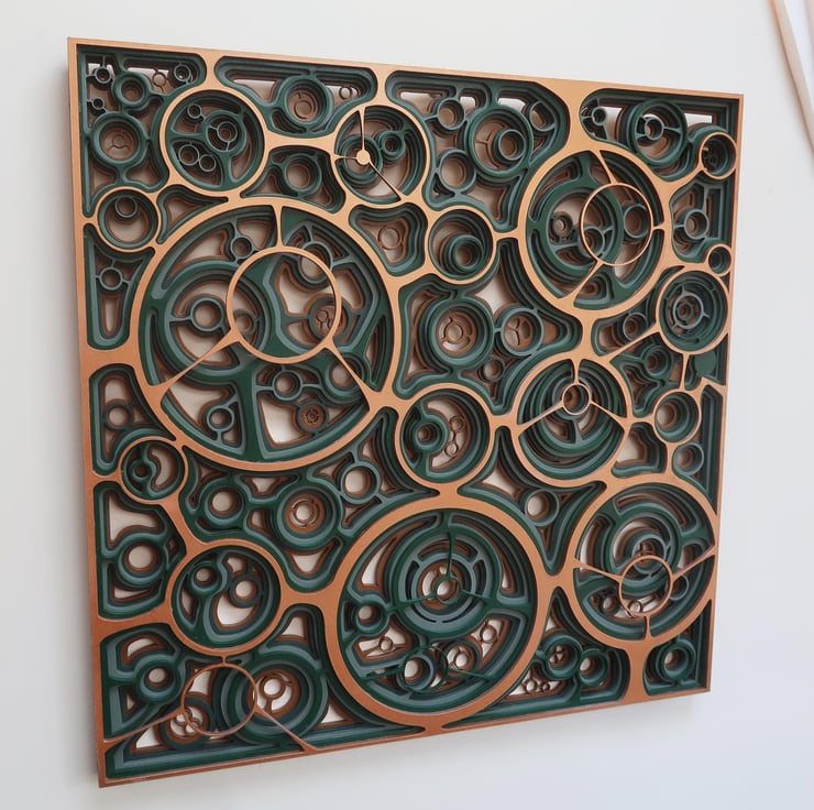 Each layer is laser cut from 4mm mdf, and the stacked layers create a sense of depth and dimension. The layering allows shadows cast around each aspect of the design enhancing the 3D effect forming a harmonious yet dynamic composition.