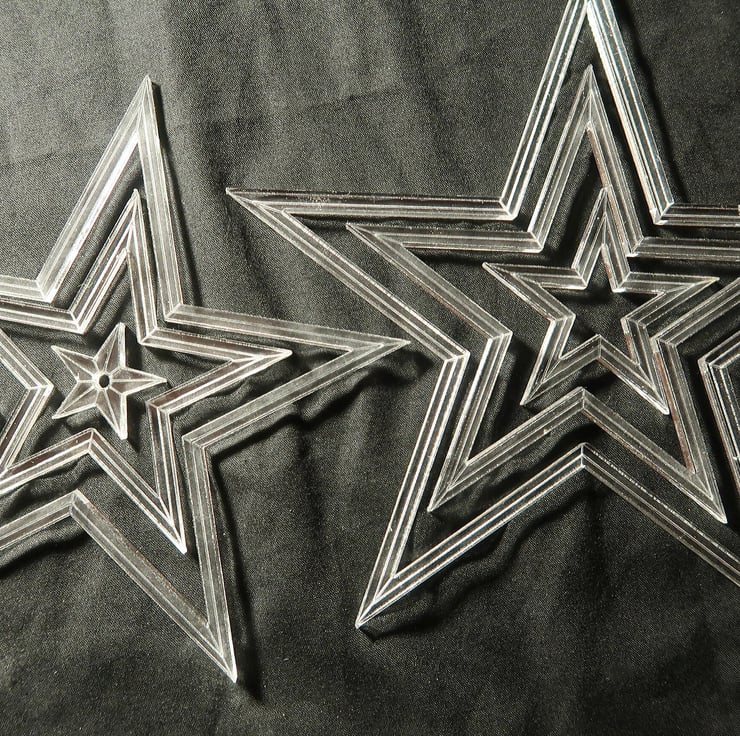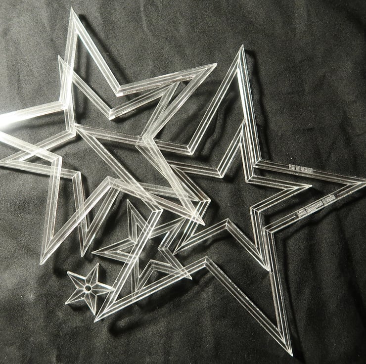 Six interlocking, or nesting star shaped templates from 6 inches (measured accross the widest part) down to 1 inch.