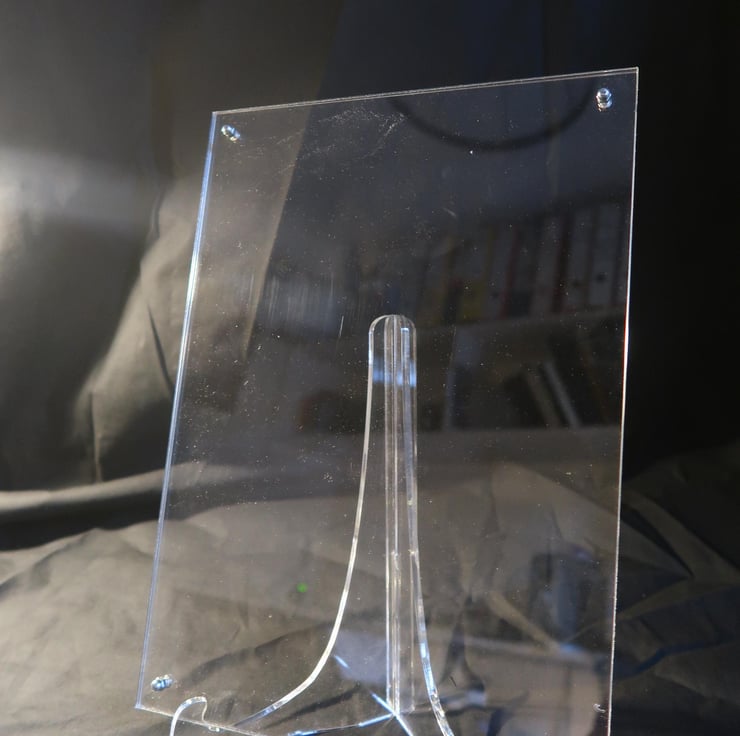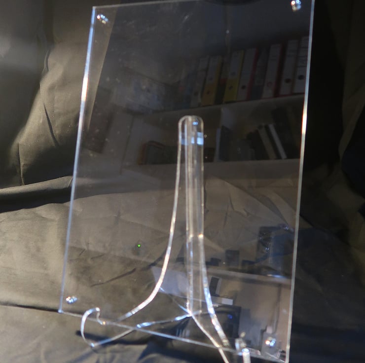 Two sheets of 3mm cristal clear acrylic clamped together with 4 stainless steel fingertight m3 nut and bolts, either in 'portrait' or'landscape', sitting on an acrylic self assembly stand, what could be easier?