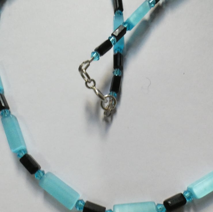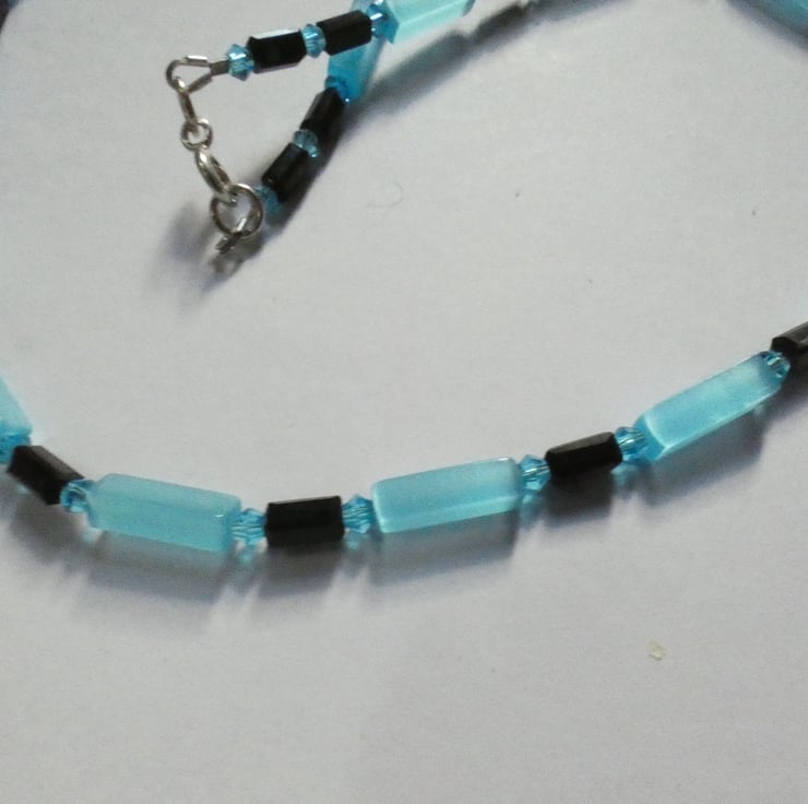 Pale turquoise cats eye beads with rectangular faceted black beads with small darker turquoise crystal beads as buffers. 18 inches long. Sterling silver fastener.
