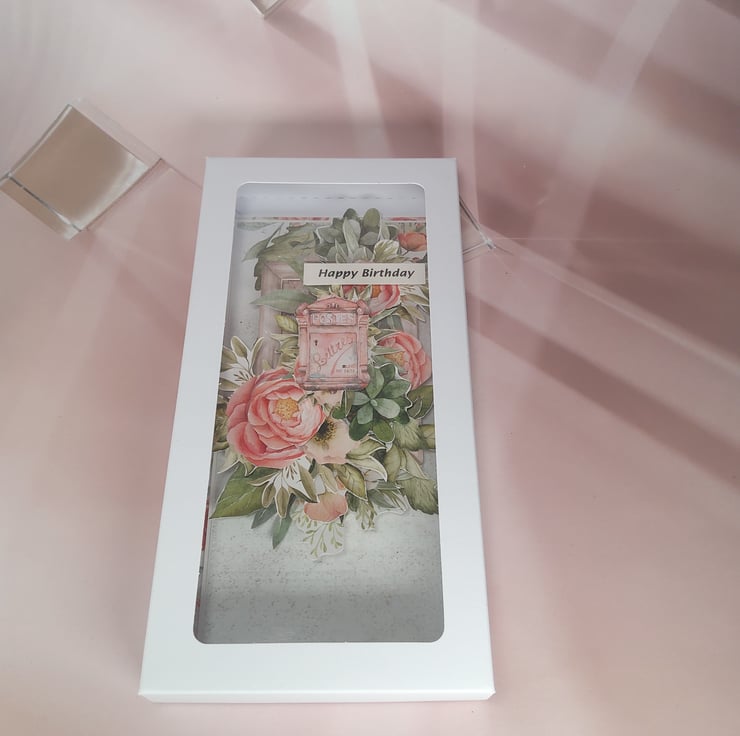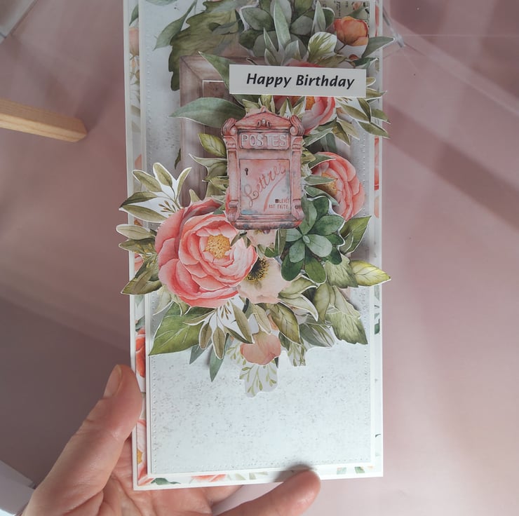 The layered composition includes hand-cut flowers, greenery, and a charming old-fashioned French postbox, creating a beautifully dimensional and delicate design.