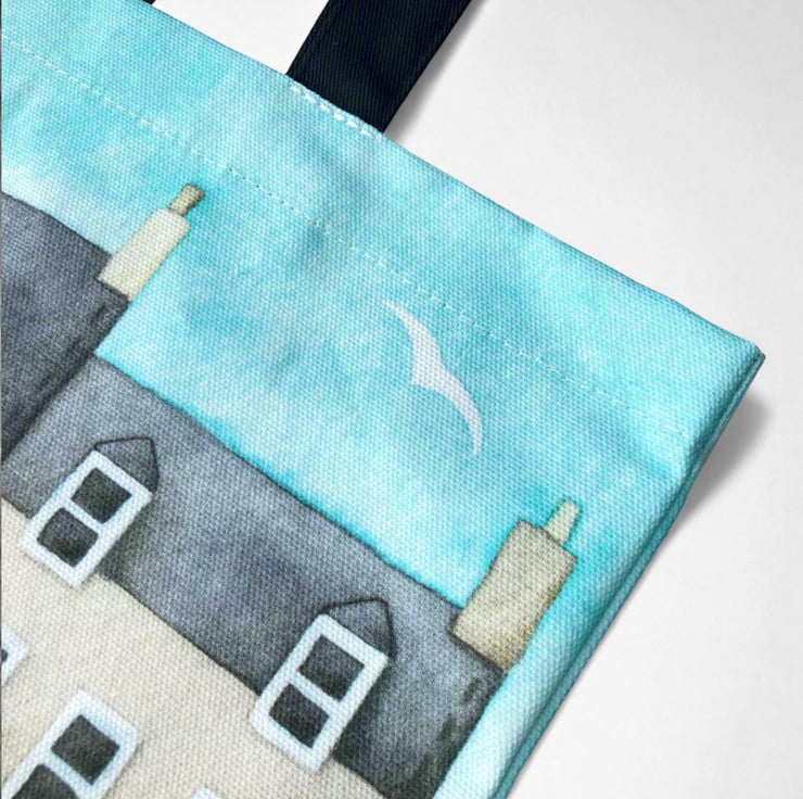 A bright, double-sided shopping bag in top quality thick 100% cotton. This beautiful tote features the famous Anstruther Fish Bar in the East Neuk of Fife. A cheeky seagull is eyeing up the fish and chips (and mushy peas!) The fish bar is bustling all year round as tourists flock to try it's famous fish suppers as well as it's homemade ice cream.