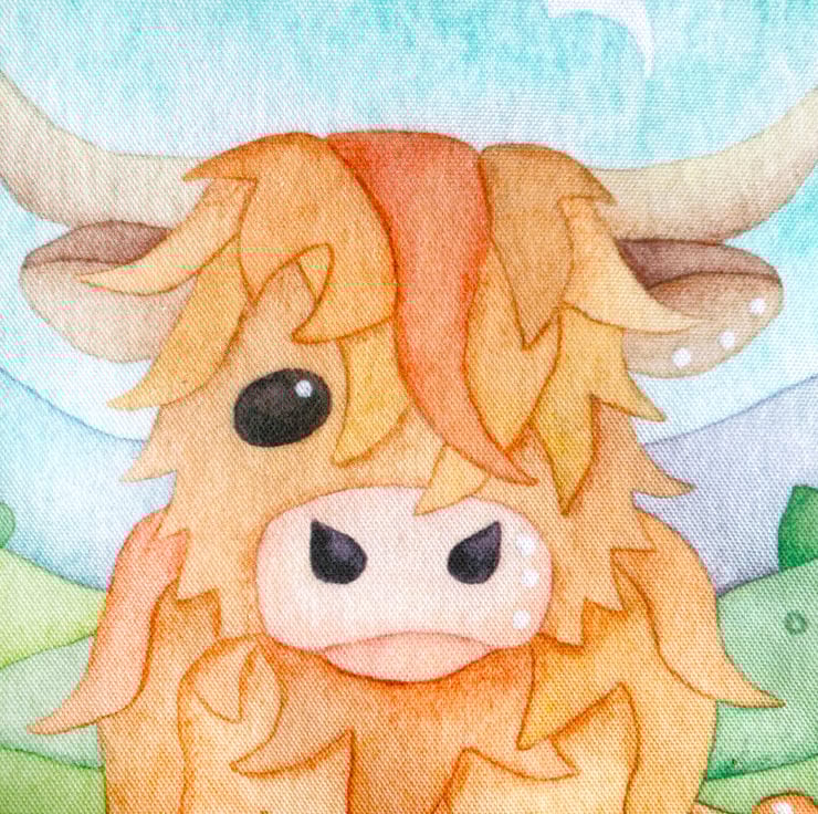 A bright, double-sided shopping bag in top quality thick 100% cotton. This beautiful tote features a shaggy Highland Cow and purple thistle in the Scottish Highlands.