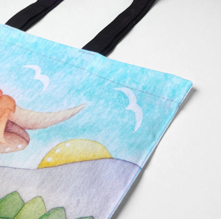 The bag features vibrant prints on both sides and is made in the UK from 100% cotton. Measuring 14 x 16 inches (36cm x 40cm), it comes with sturdy black fabric handles. Perfect for adding a splash of colour to your shopping trip!