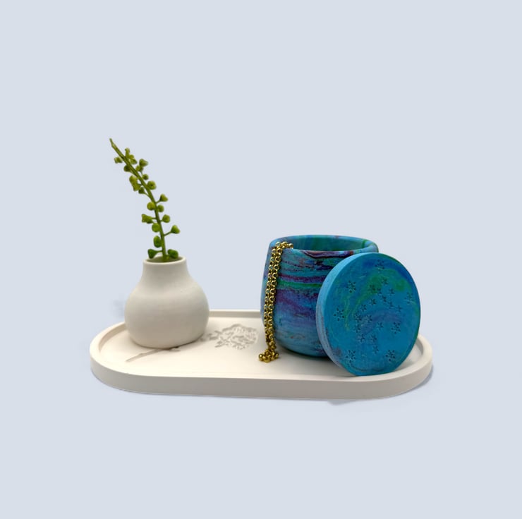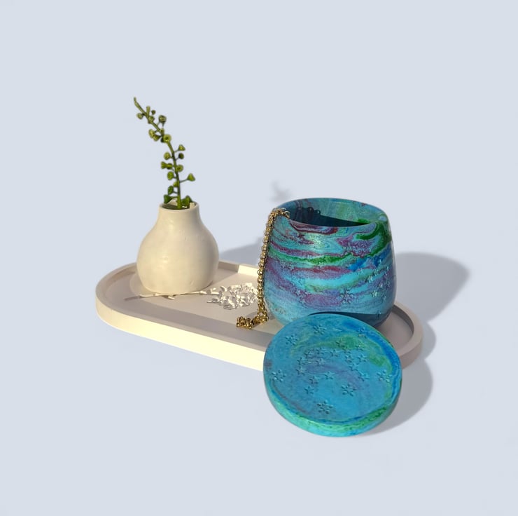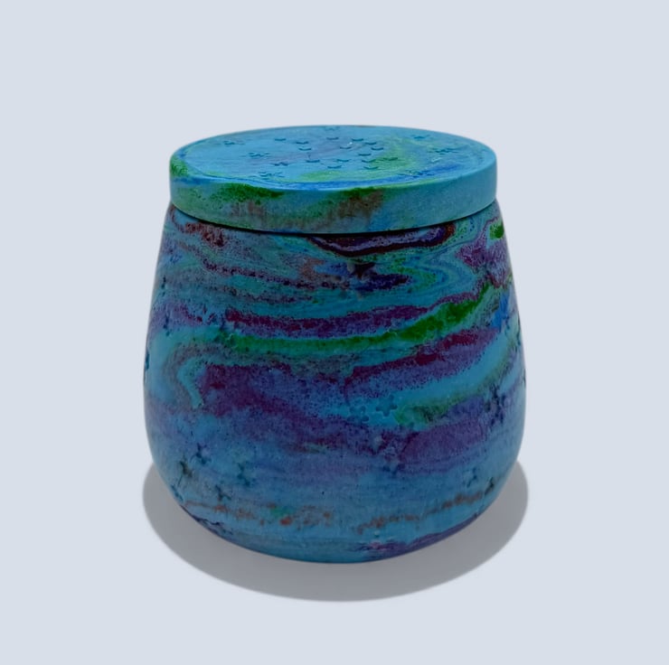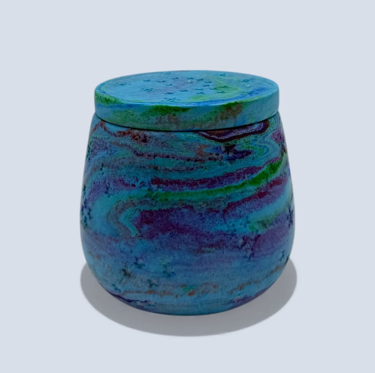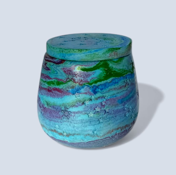 I made this trinket pot after seeing the incredible aurora display in October 2024. The sky was filled with streaks of turquoise, violet and soft green that moved and blended like flowing paint. I wanted to capture that feeling of colour drifting across the sky, so I used a mix of pigments that marble together in the same gentle way. The swirling pattern that formed on this pot is completely unique and reminded me of standing under those shifting lights, watching the colours change and fade from one moment to the next. It is a small piece of that memory, shaped into something you can keep and use every day.