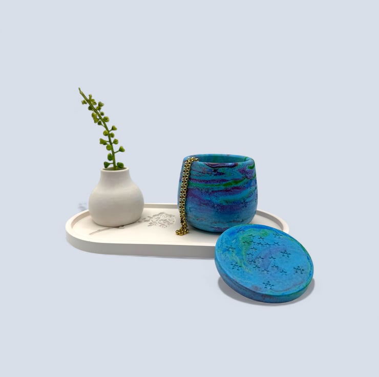 Each box is handmade from a natural water-based mineral material with a hard stone-like finish. The marbled colours swirl softly around the pot and lid, creating a one-of-a-kind pattern with gentle flowing tones. The exterior is hand-polished and sealed with two coats of plant-based wax sealer for a soft satin sheen, while the interior is left unsealed to maintain the natural texture of the material. Small air bubbles and slight colour variations are part of its handmade character.