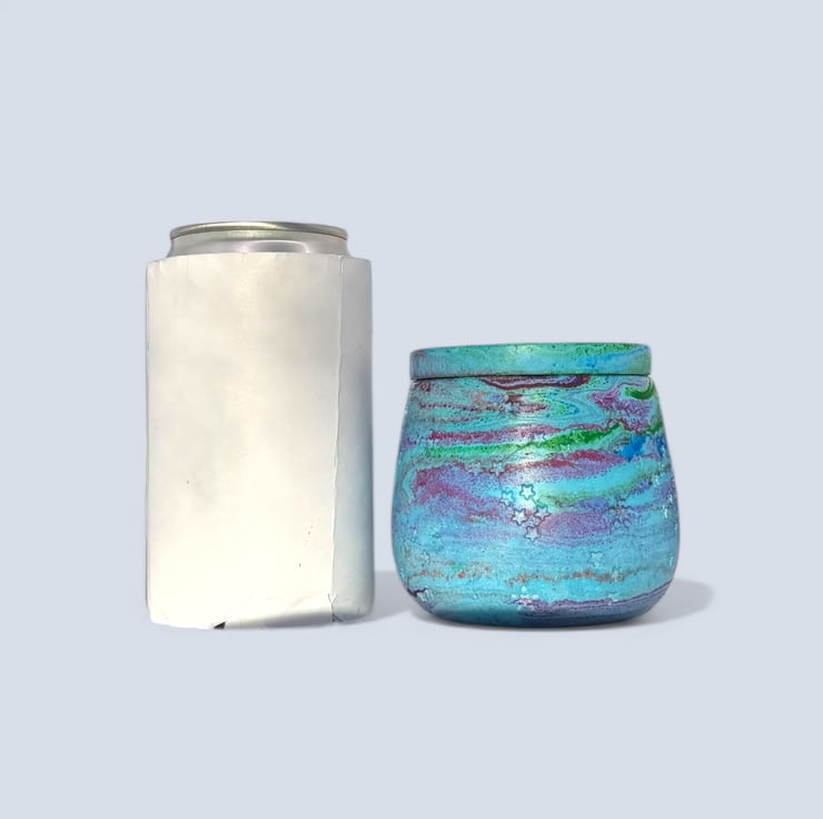 Blue marbled jewellery box with a fitted lid, handmade in shifting tones of turquoise, purple, pink and green. This small decorative piece is ideal for storing jewellery, rings, earrings or tiny keepsakes, and it also works beautifully as a candle jar for tealights or small votive candles. The lid can then be used as a coaster to protect surfaces from heat. It makes a versatile and thoughtful gift for anyone who loves vibrant, handmade home decor.