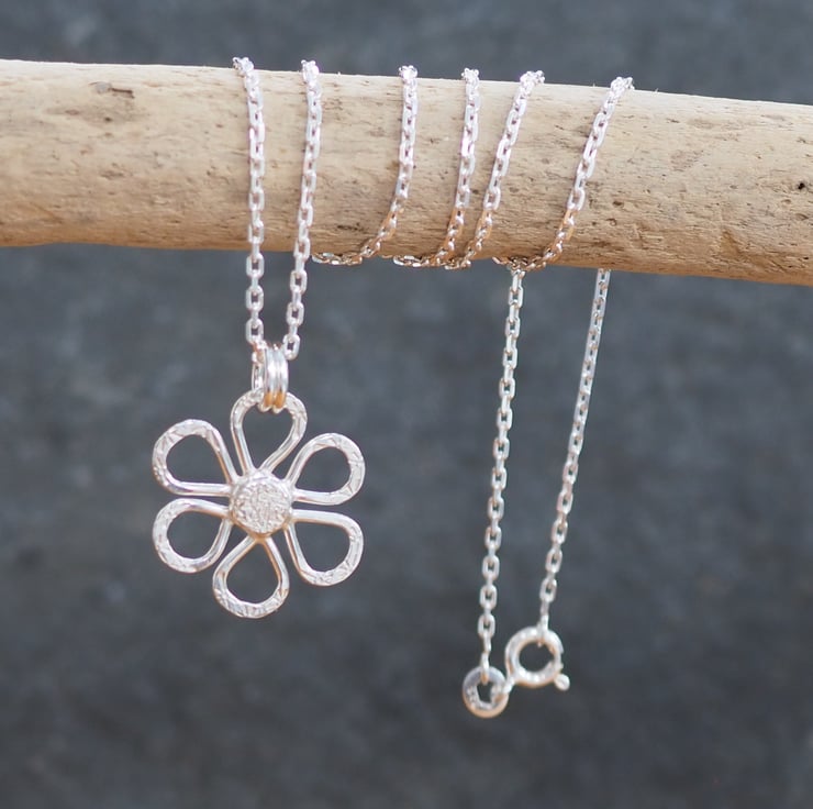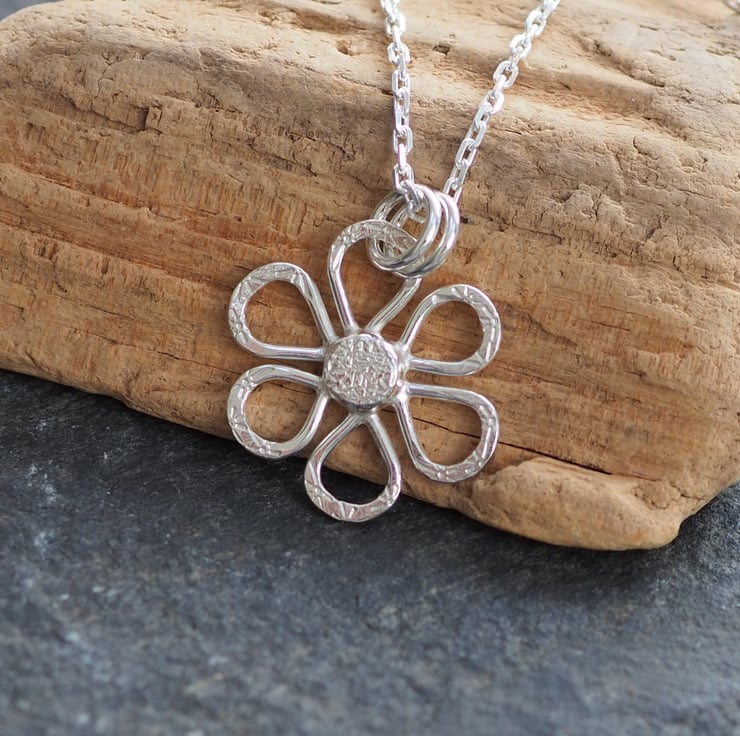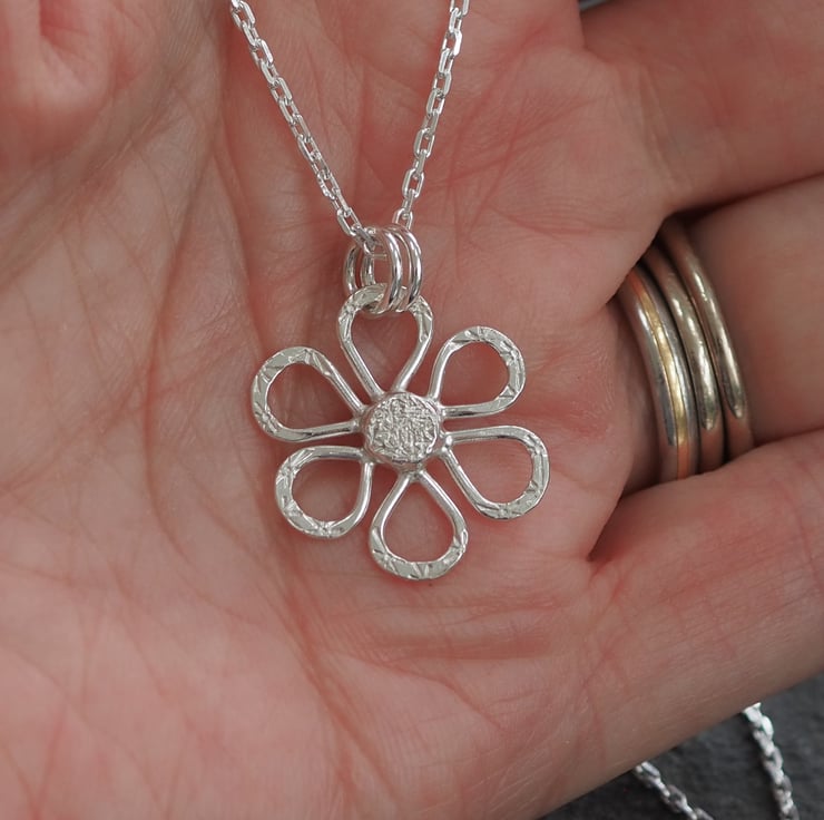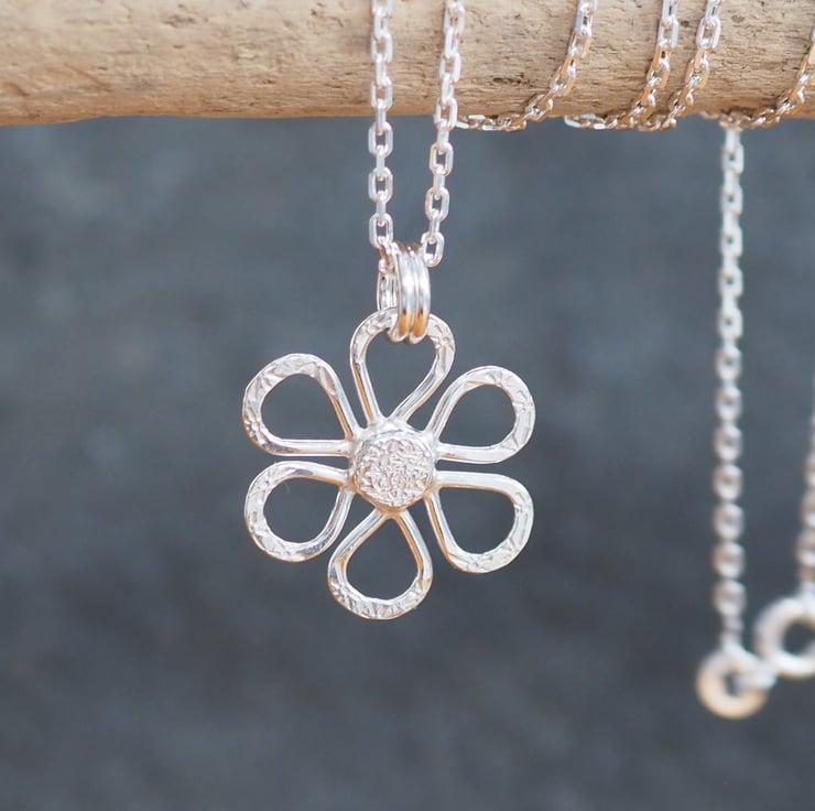 Hand crafted silver daisy pendant necklace. The silver has been hammered with a floral pattern and polished to a bright shine.
