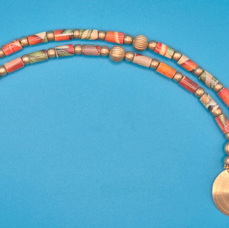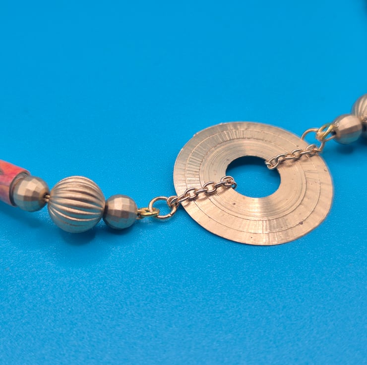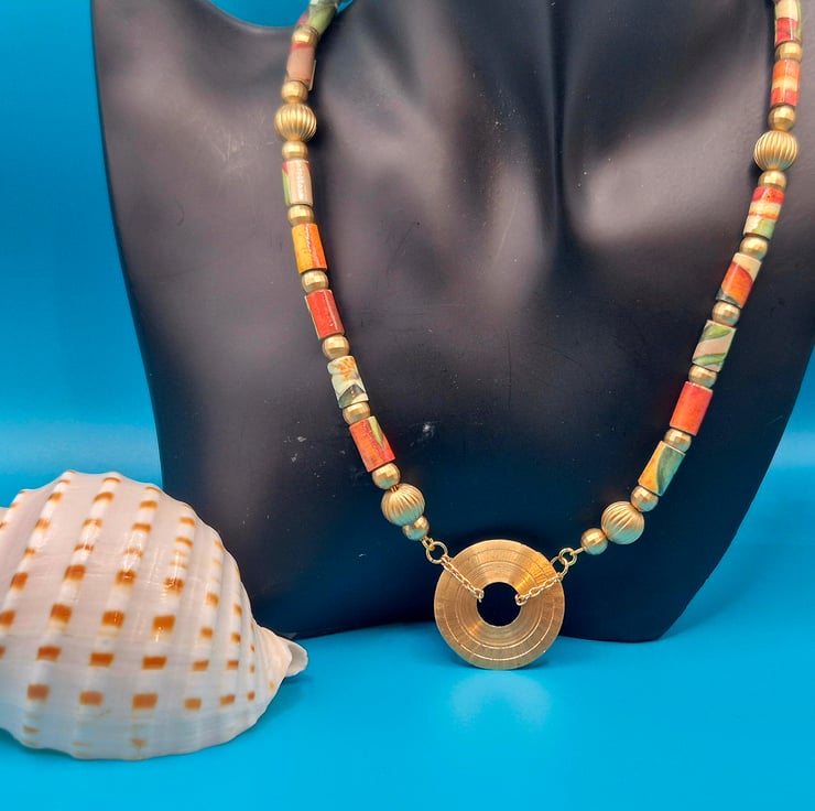 This is quite a unique necklace made of a recycled soap wrapper which had a lovely orange and green leaf design. The wrapper was turned into little tubular beads which were then interspersed with golden multifaceted spacer beads which gave a very elegant look to the piece. Finished with a home made central metal circle (see story below).