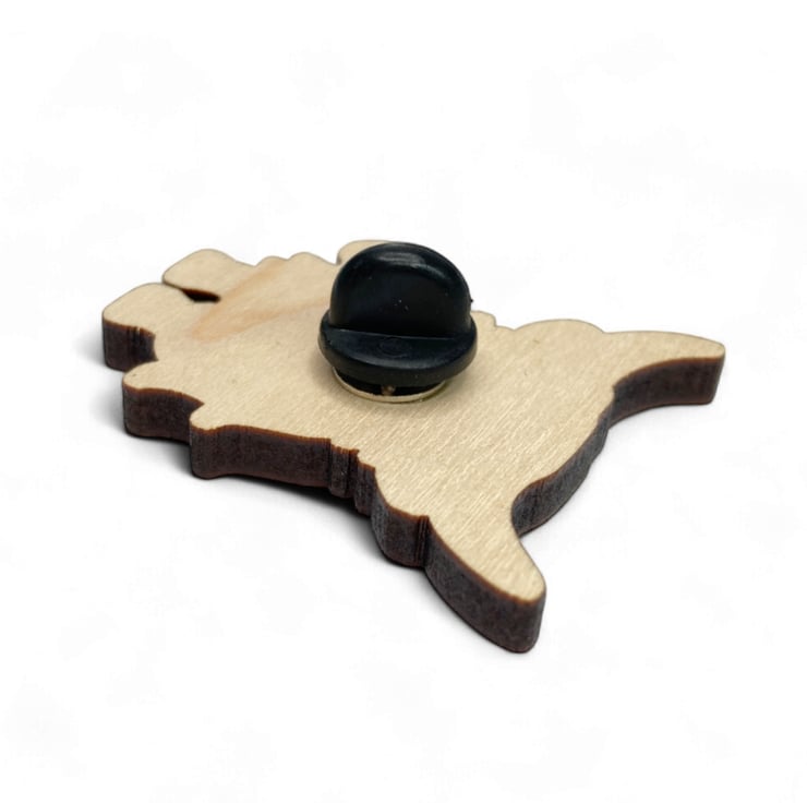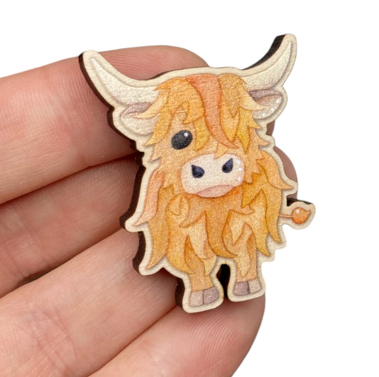 A pin badge with a very cute highland cow. Crafted from beautiful maple wood, the badges are laser-cut and printed with vivid colour and amazing detail!