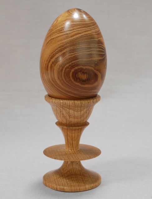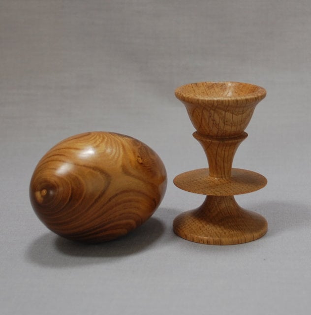 Turned from local woods-the oak stand is made from our oak tree Gabriel. While the stunning laburnum wood of the egg is from the next-door neighbour’s tree. Extremely tactile the egg is a pleasing weight when held in the hand. The stand is approximately 7 cm high and 5 cm in diameter. Together with the egg (9cm by 5.5. cm) it stands 13 cm tall.