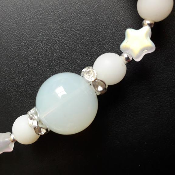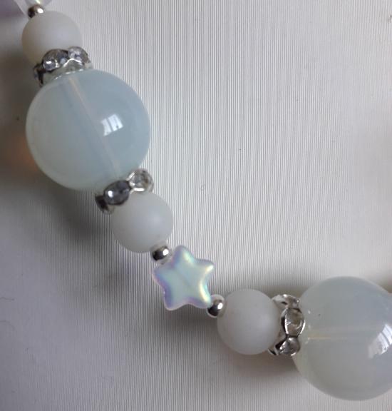 This necklace is made up of 3 large semi opaque glass beads, they are approximately 1.5cm diameter, white opaque rounds, iridescent star beads, aroura borealis clear crystal cushions and sparkly rondels, also small silver round spacer beads.