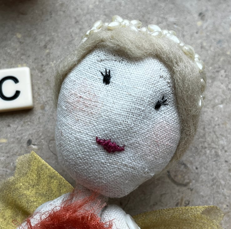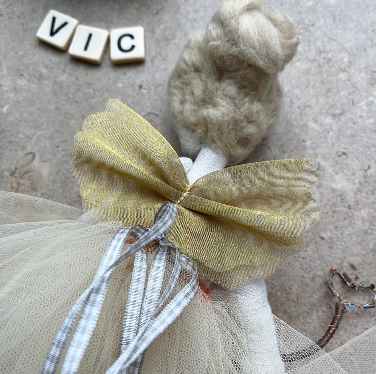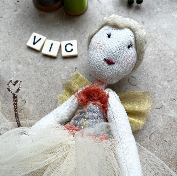 Vic’s face is embroidered by hand. Her hair is made from wool fleece and she wears a pearly headband. She carries a beaded wand.