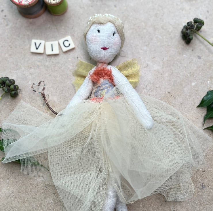 Beautiful one of a kind fairy to top your Christmas tree or offer a little magic all year round. Vic is a unique Christmas decoration made from reclaimed linen, tulle and silk.