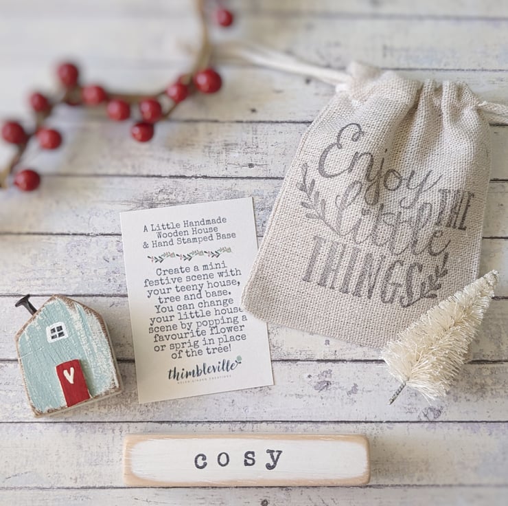 A teeny wooden house scene in a bag, with a festive tree that you can change to your own decoration!